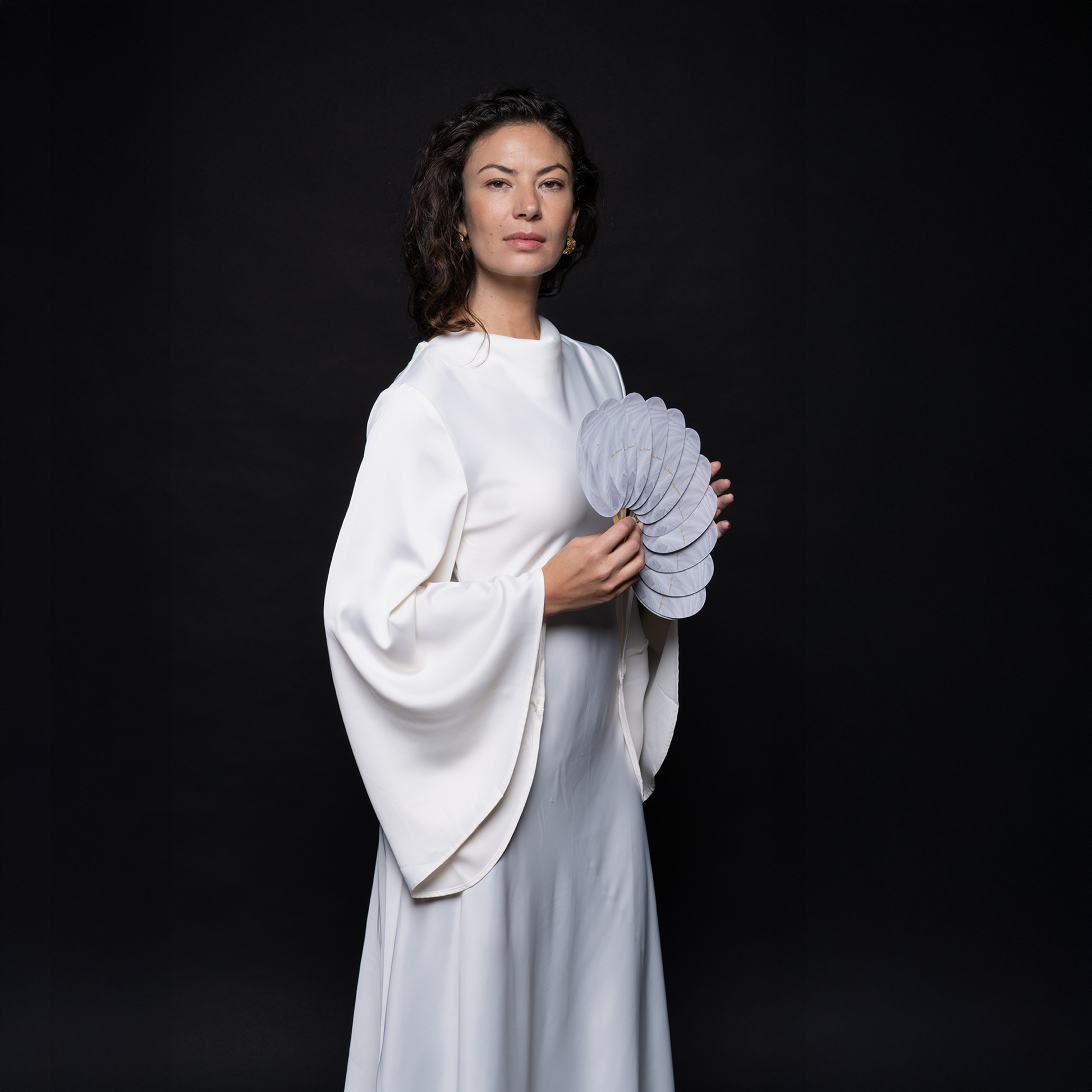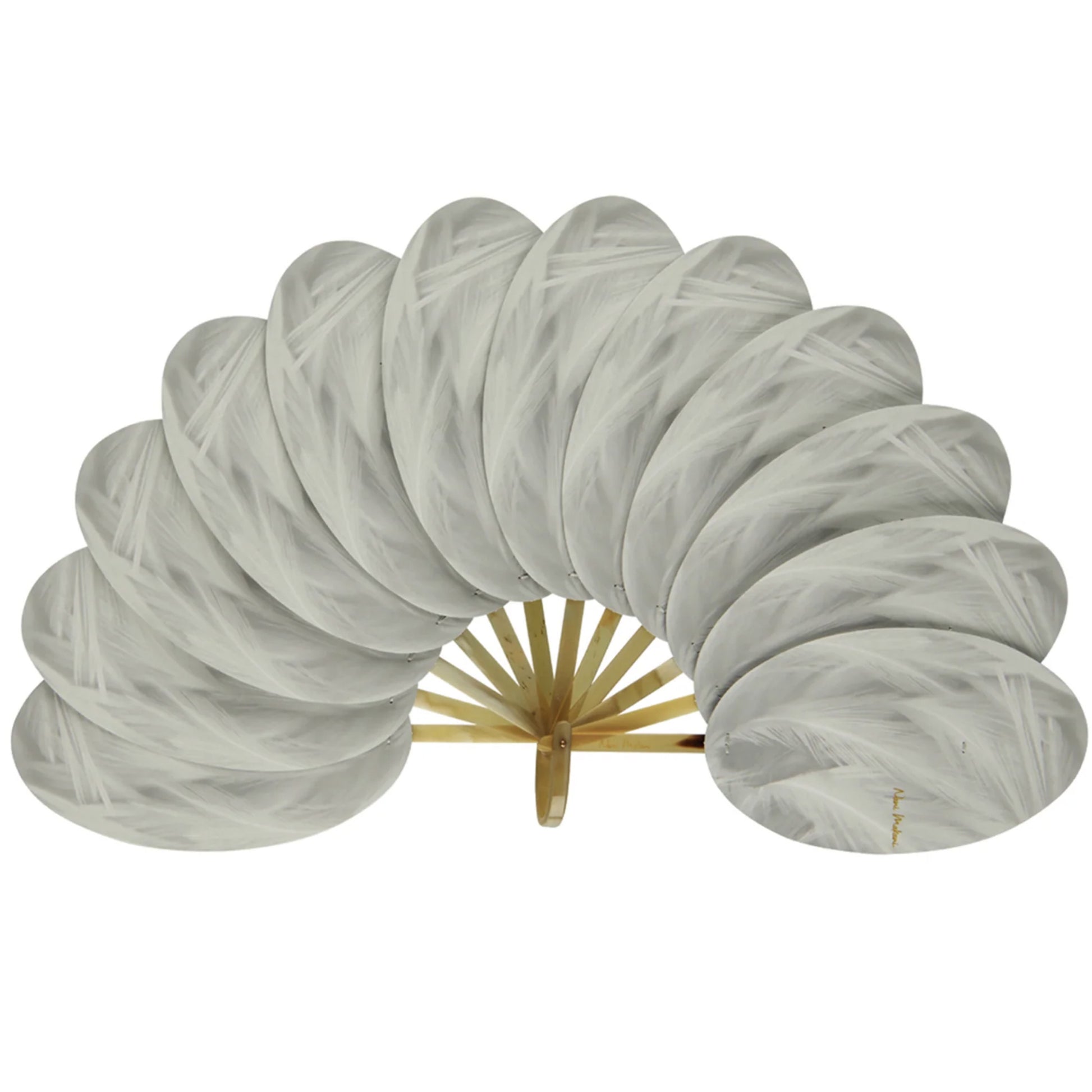 fan embodies this quiet elegance with its soft palette of white and gentle gray tones. Effortlessly versatile, it complements both understated outfits and vibrant silk kimonos or colorful dresses with equal grace.